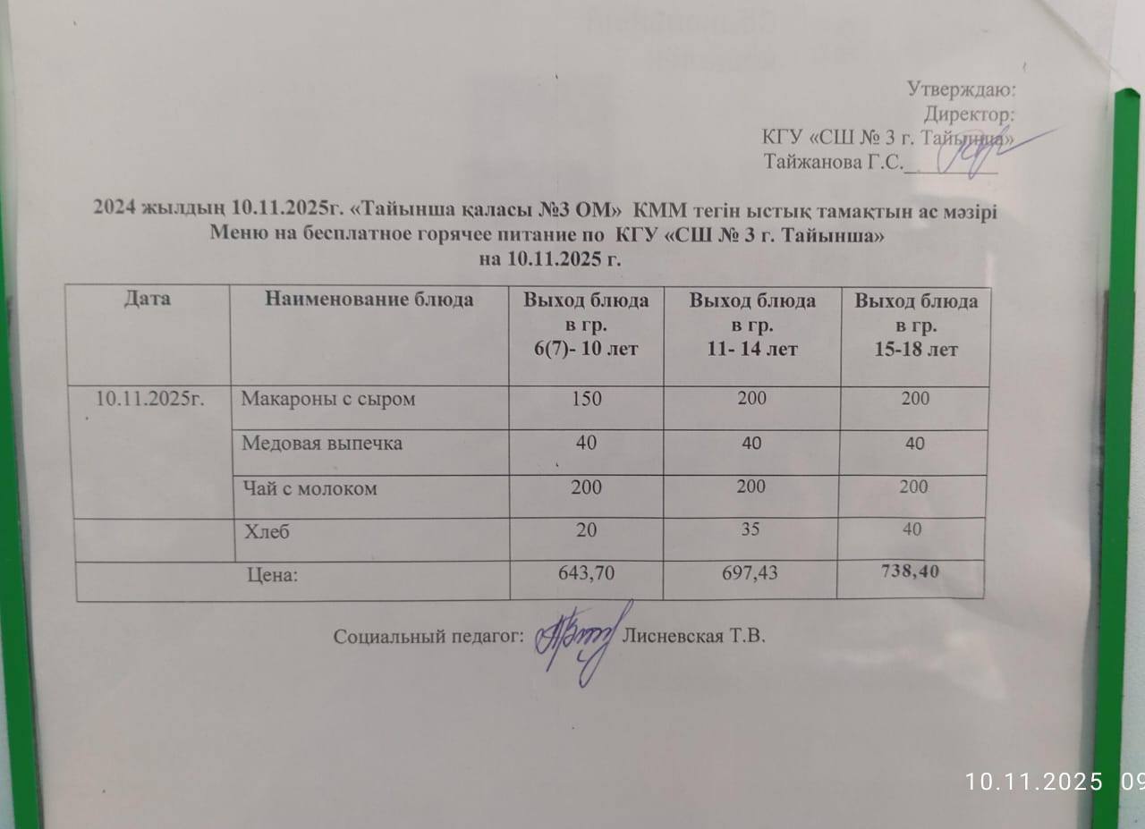 “Жалпы білім беру” — «Всеобуч» Автор admin Чтение 1 мин Число просмотров 14 Опубликовано 10/11/2025 2025 жылдың 10 қарашанына арналған “Жалпы білім беру” қорынан тегін ыстық тамақ мәзірі. Меню бесплатного горячего питания из фонда «Всеобуч» на 10.11.2025 г.
