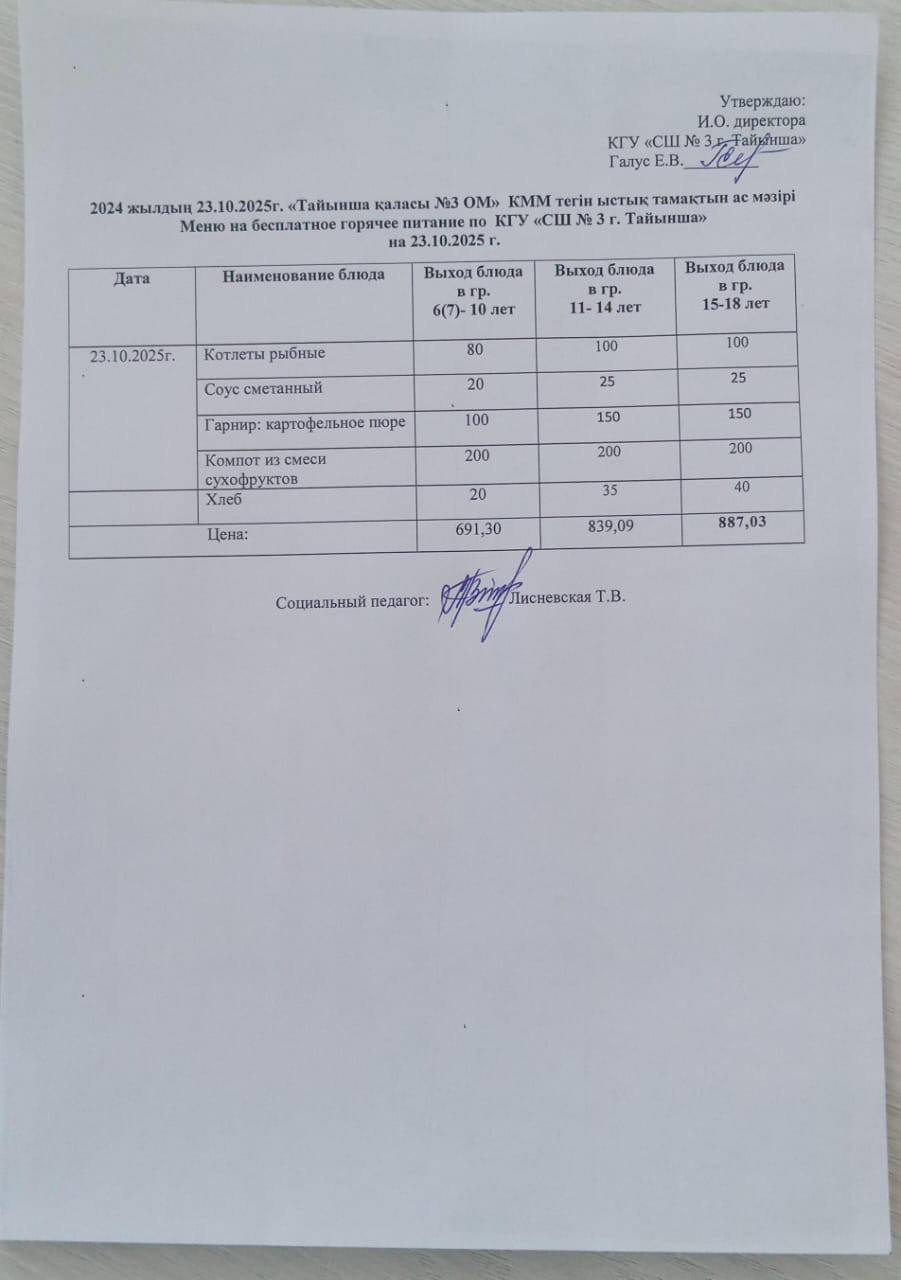 Тегін ыстық тамақ мәзірі -Меню бесплатного горячего питания Автор admin Чтение 1 мин Число просмотров 14 Опубликовано 23/10/2025 2025 жылдың 23 қазанына арналған “Жалпы білім беру” қорынан тегін ыстық тамақ мәзірі. Меню бесплатного горячего питания из фонда «Всеобуч» на 23.10.2025 г.