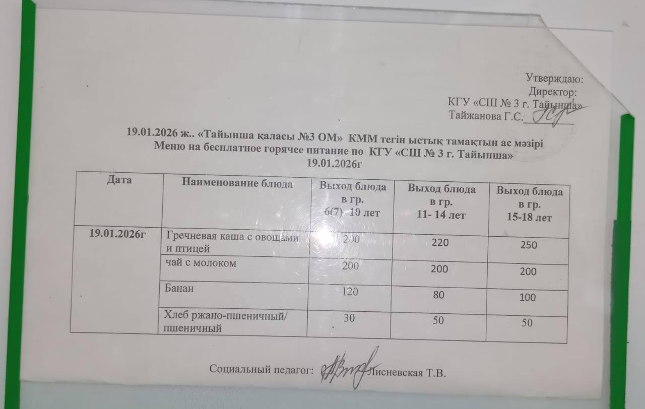 #Тегін_ыстық_тамақтану #Бесплатное_горячее_питание Автор admin Чтение 1 мин Число просмотров 18 Опубликовано 19/01/2026 #Тегін_ыстық_тамақтану #Бесплатное_горячее_питание Тегін ыстық тамақтану мәзірі «Всеобуч» қорынан 2026 жылғы 19 қаңтар Меню бесплатного горячего питания из фонда «Всеобуч» 19 января 2026 года
