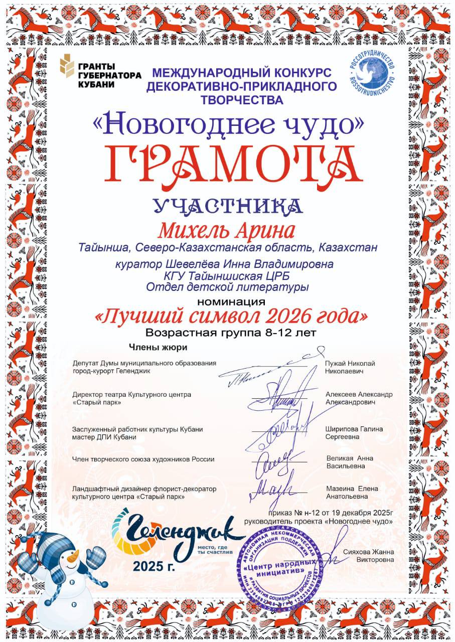 Арина өз жұмысына үлкен еңбек пен ықыласын арнады. Жарайсың! Тек қана алға, жаңа биіктерге ұмтыл!Михель Арина ученица 6 «Б» класса приняла участие в международном конкурсе «Новогоднее чудо» и стала обладательницей почетной грамоты в номинации «Символ года». Выиграть — задача не из простых! В этом году на конкурс поступило 15549 заявок, приняли участие жители регионов России и 4073 заявки из 221 –й зарубежной страны: Абхазия, Беларусь, Греция, Иран, Испания, Казахстан, Кипр, Киргизия, Ливан, Мальта, Молдова, Монголия, ПМР, Палестина, Сингапур, Таджикистан, Тунис, Туркменистан, Узбекистан, Франция, Хорватия, Чехия и др.