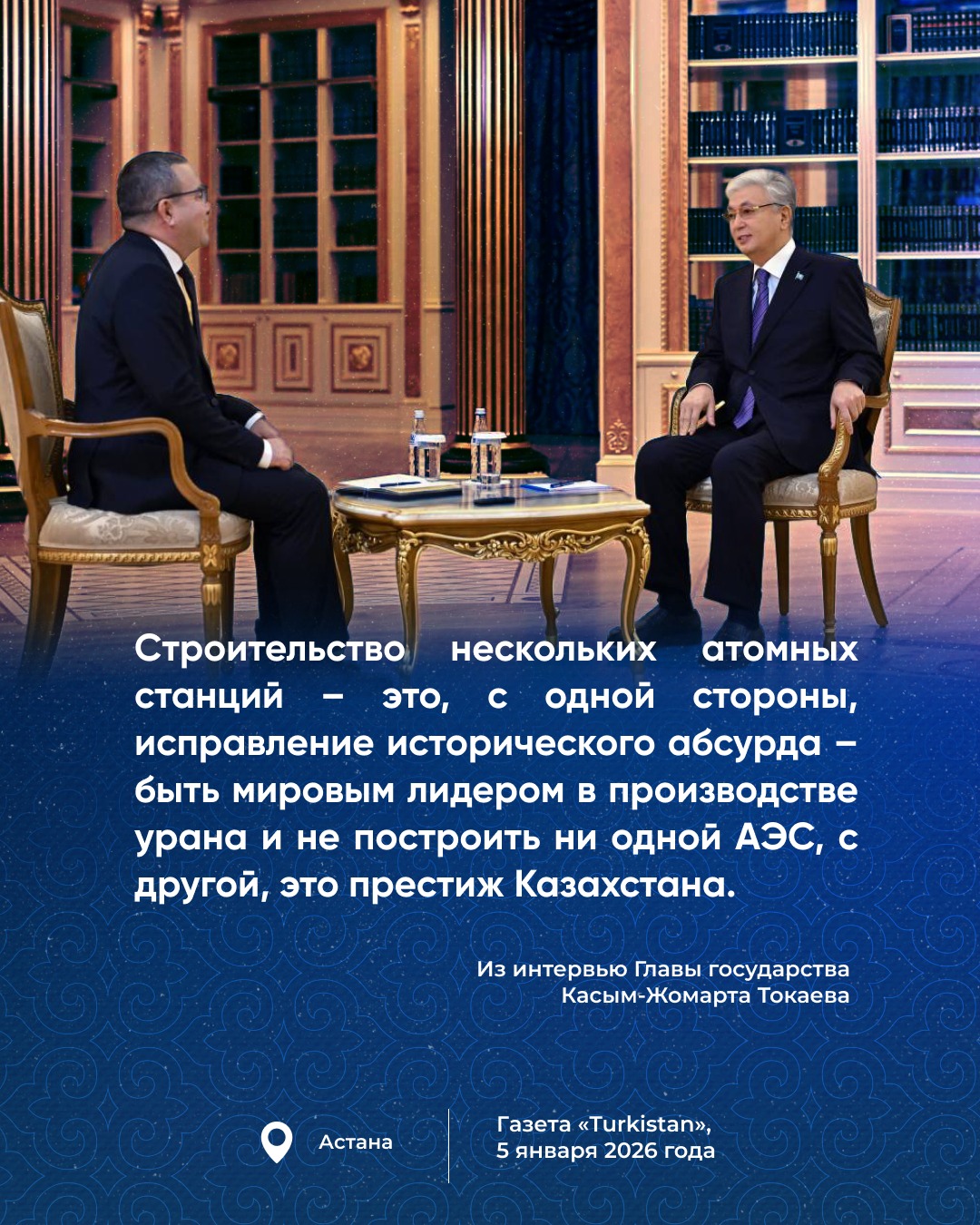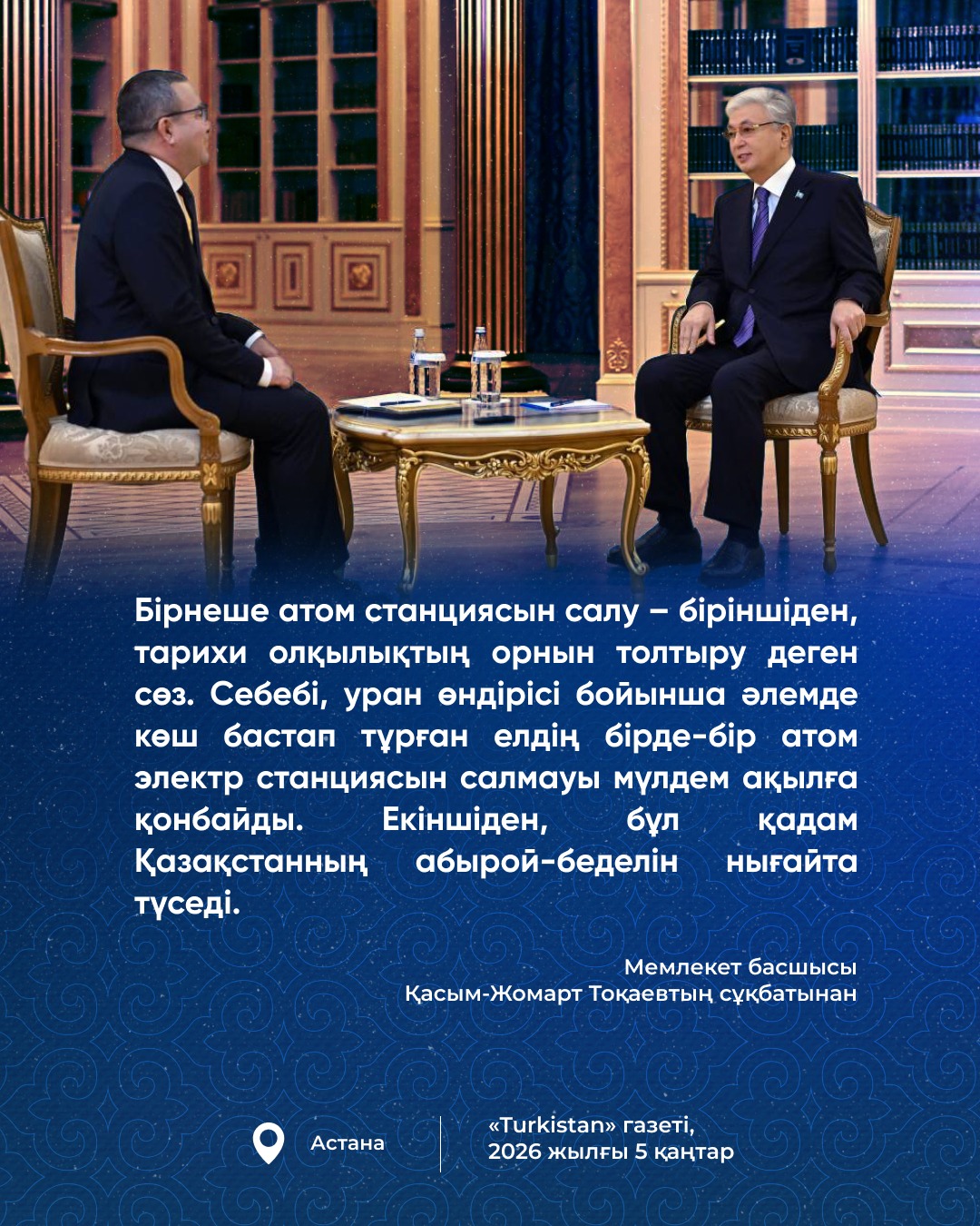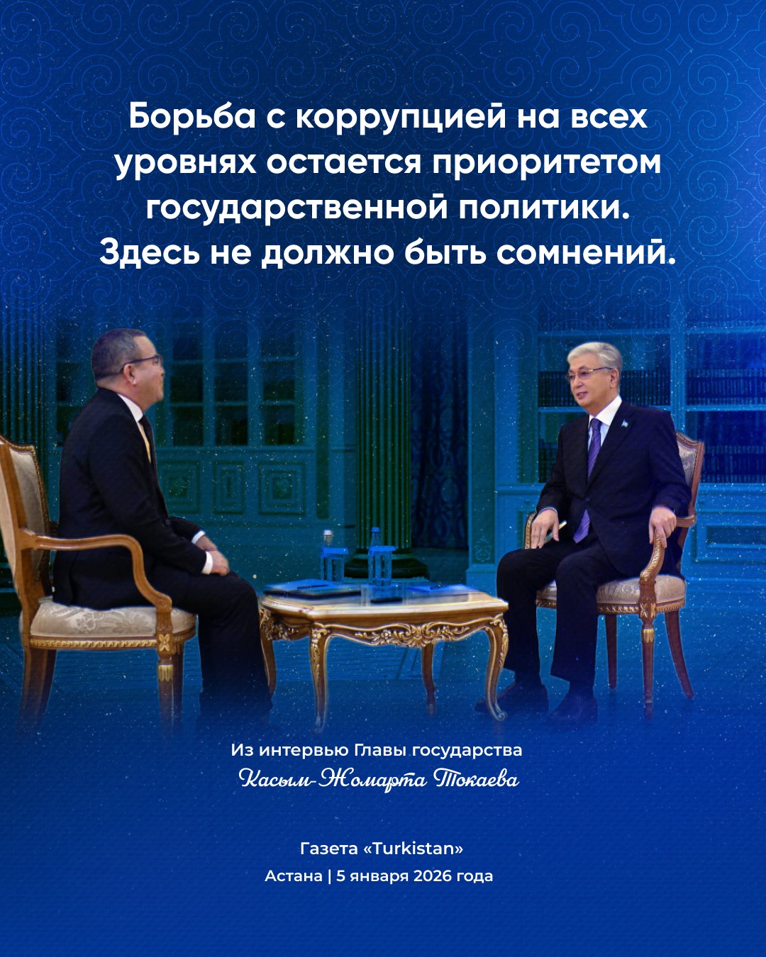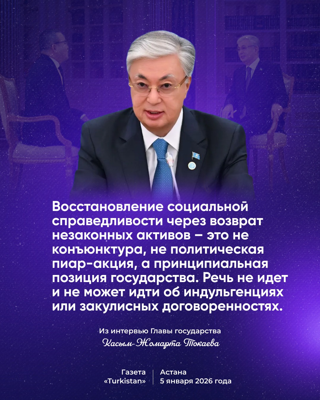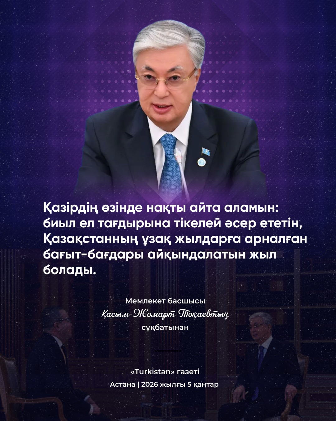 Президент Казахстана Касым-Жомарт Токаев в первые дни 2026 года дал большое интервью газете «Turkistan». Текст интервью опубликовала Акорда, передает NUR.KZ.